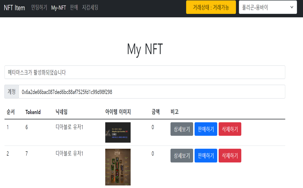 입출금 기능: 사용자는 발행한 Item(NFT)을 플랫폼 내 거래소에 등록하고, 다른 사용자들과 거래할 수 있습니다.