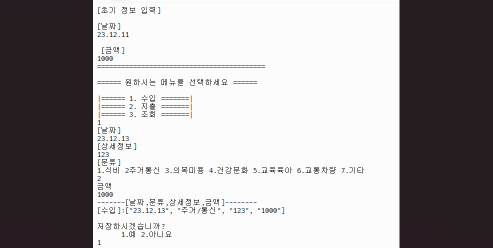 계좌 조회:입력된 내역들을 기반으로 총 지출과 수입을 계산하고 출력할 수 있습니다.